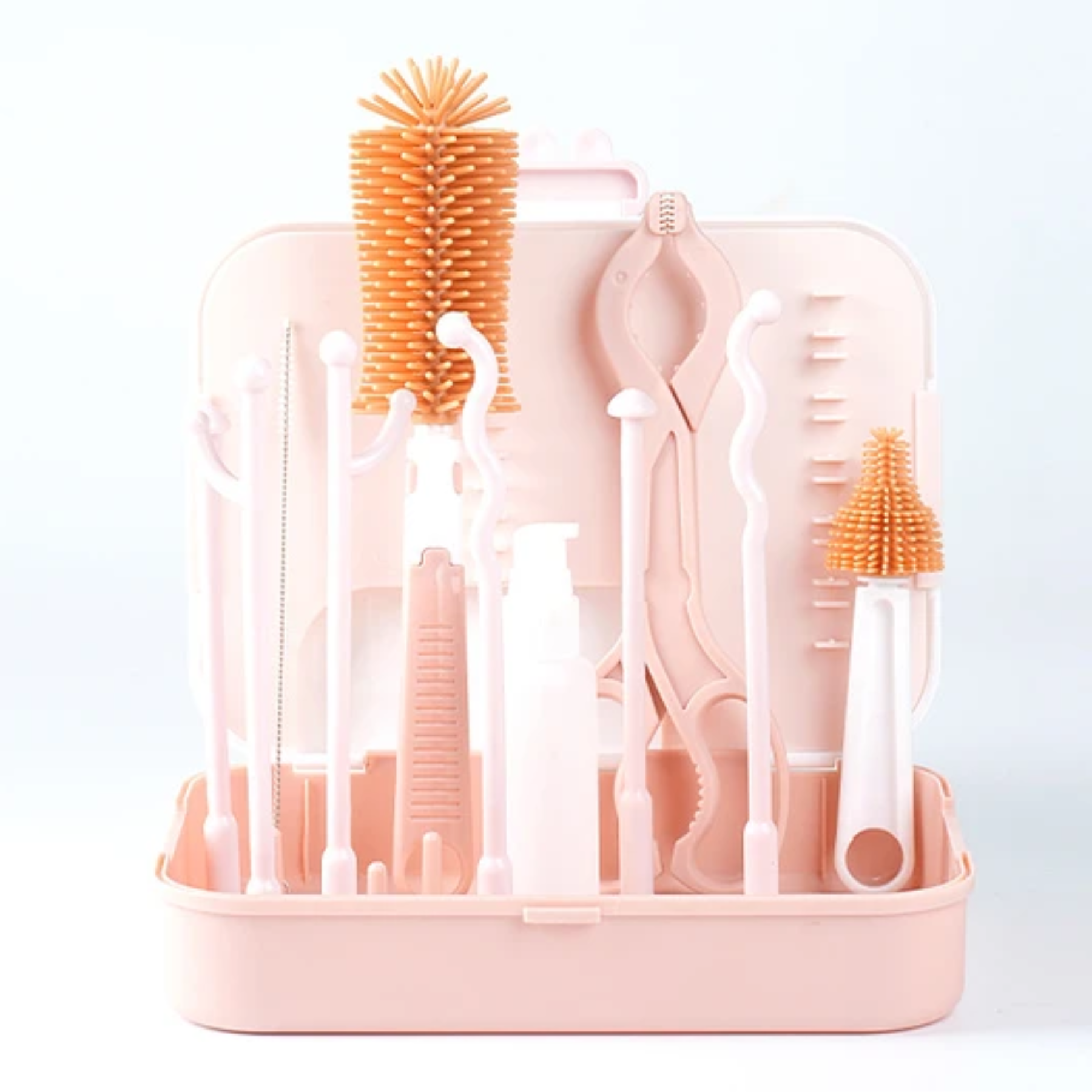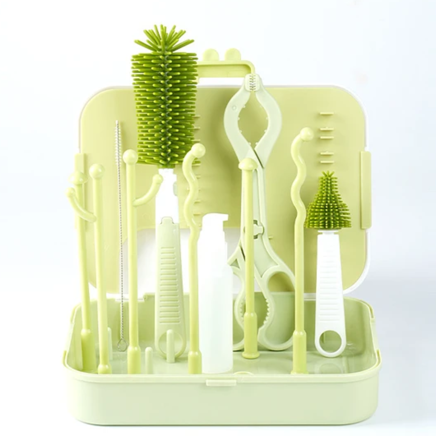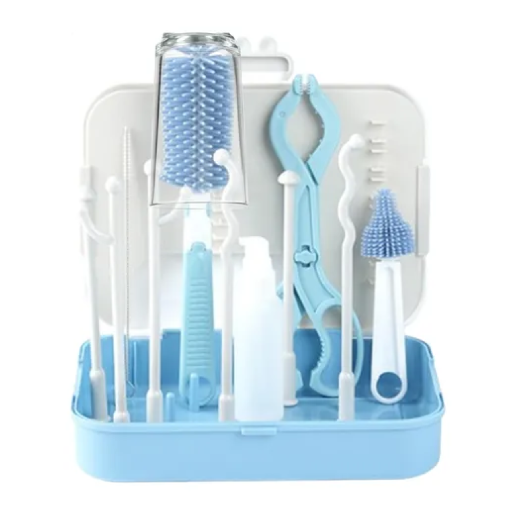 -Incluye un soporte o base para secar mamaderas, tetinas y piezas pequeñas de forma ordenada e higiénica, evitando la acumulación de humedad y bacterias. Además, trae cepillos de distintos tamaños con cerdas suaves y resistentes para limpiar a fondo el interior de los biberones, chupetes y otros utensilios.